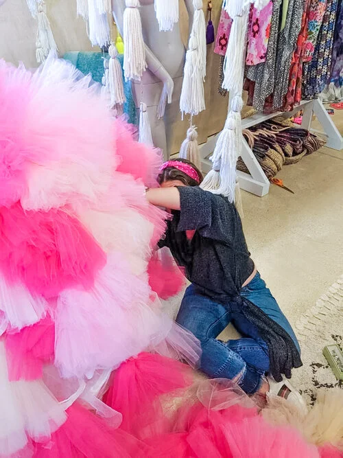 She was given the honor of having the featured position in the exhibit and created a 16 ft gown with 200 yards of tulle, hand appliquΓ©d stars and a custom swing for the mannequin to sit on.