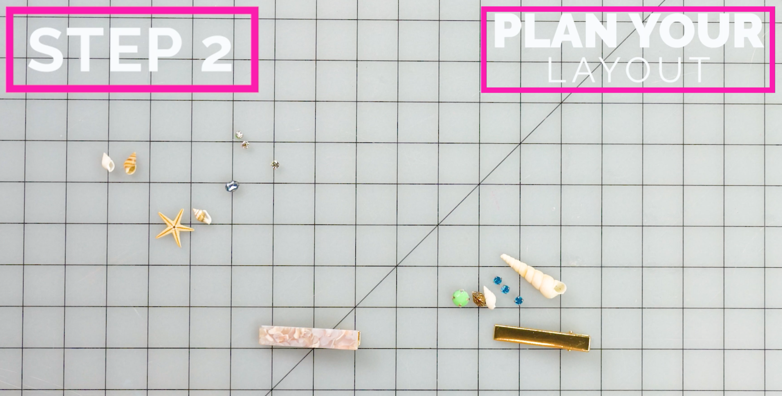 Now is the time to switch those gems and shells around and see how you like them placed. I like to have my barrette right below where I’m laying things out to keep my size right. Switch them around, exchange this gem for that and have fun! But definitely get something you love before the glue comes out!