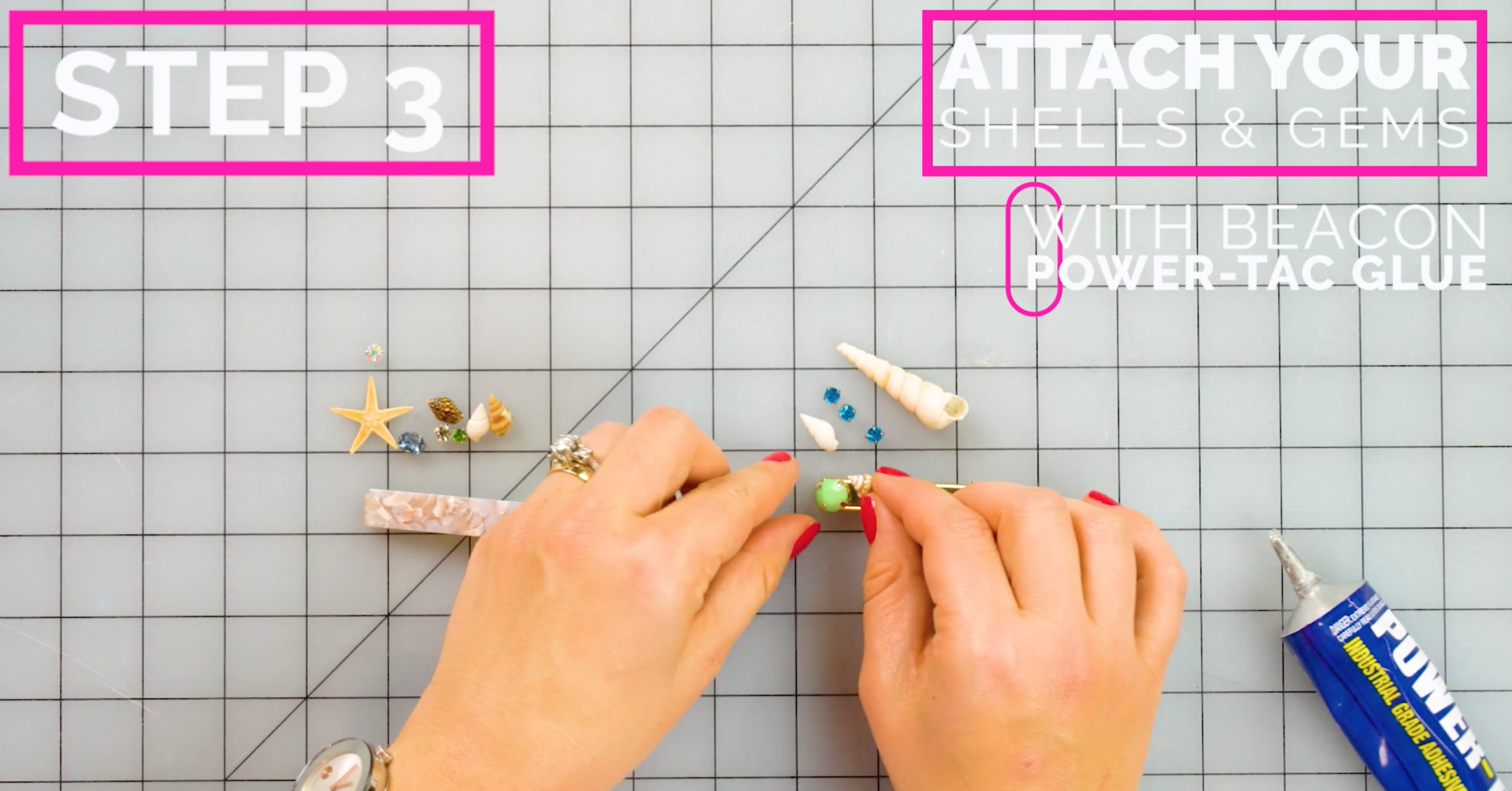 Using the Beacon Power-Tec glue, I like to apply a tiny dab of glue to the back of my gems or shells one at a time and then place them on your barrette one at a time. As you place the next gems, do so carefully so you don’t knock off the ones you’ve already placed.
